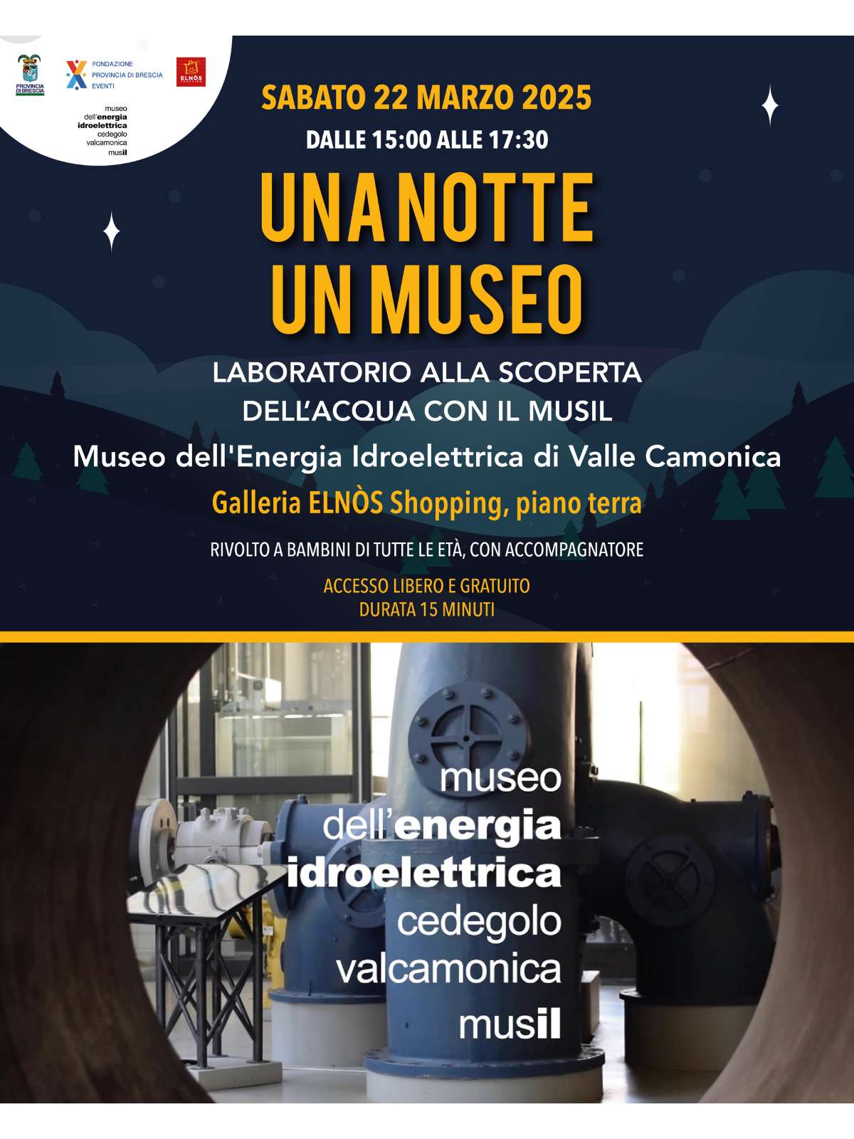 Sabato 22 marzo, dalle 15:00 alle 17:30, non perdere il laboratorio "Alla scoperta dell’acqua" con il Musil – Museo dell’Energia Idroelettrica: un laboratorio interattivo che guiderà i più piccoli alla scoperta dei segreti di un’energia invisibile, ma capace di cambiare il nostro mondo.