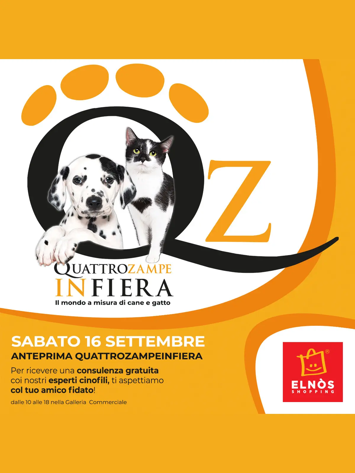 QuattroZampeInFiera - Il mondo a misura di cane e gatto è di nuovo in anteprima a ELNÒS Shopping! Approfitta dell'occasione per venire a trovarci sabato 16 settembre dalle 16 alle 18 nello Spazio Eventi per una consulenza gratuita da parte di esperti cinofili con il tuo amico a quattro zampe!