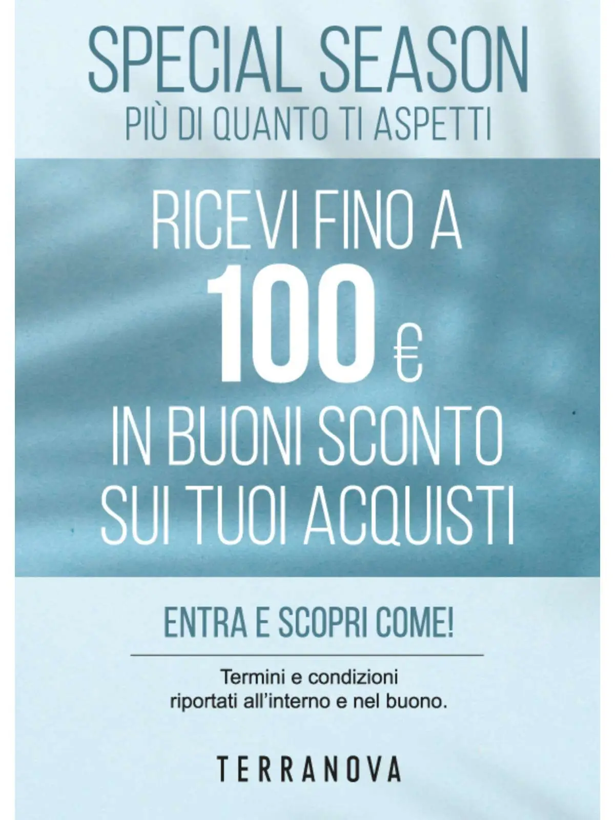 Ciao! Lo sai che da Terranova puoi ottenere fino a 100 euro in buoni sconto? Vieni a trovarci e scopri come riceverli. Terranova, più di quanto ti aspetti!