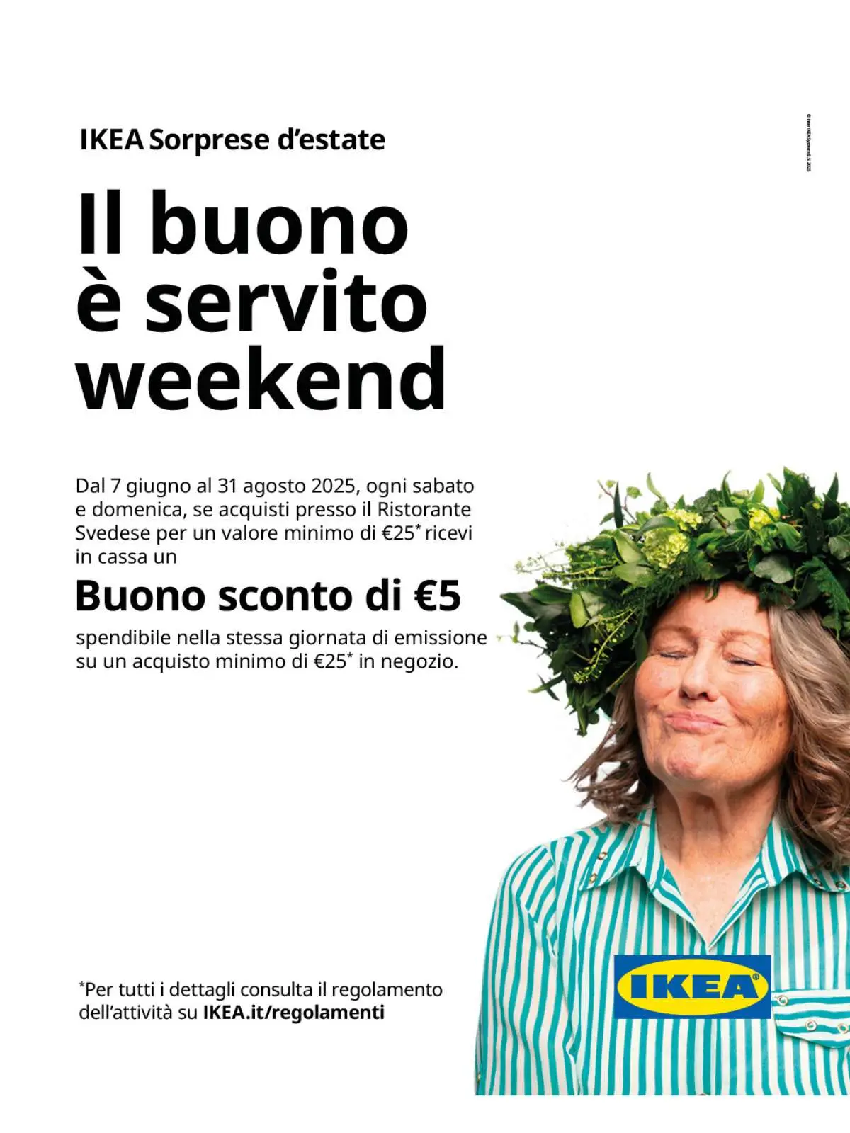 Dal 7 giugno al 31 agosto 2025, ogni sabato e domenica, se acquisti presso il Ristorante Svedese per un valore minimo di €25* ricevi in cassa un buono sconto di €5 spendibile nella stessa giornata di emissione su un acquisto minimo di €25* in negozio.