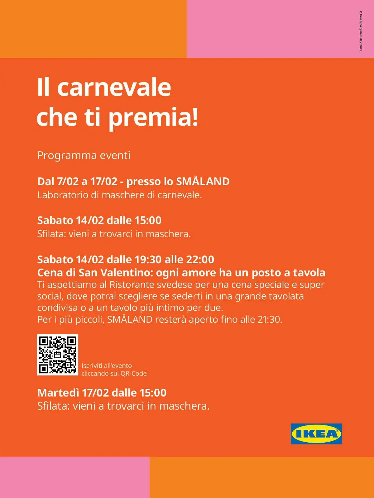 Dalle 19:30 alle 22:00, Cena di San Valentino al Ristorante svedese: scegli tra tavolata condivisa o tavolo per due. SMÅLAND aperto fino alle 21:30.Martedì 17 febbraio alle 15:00 torna la sfilata.