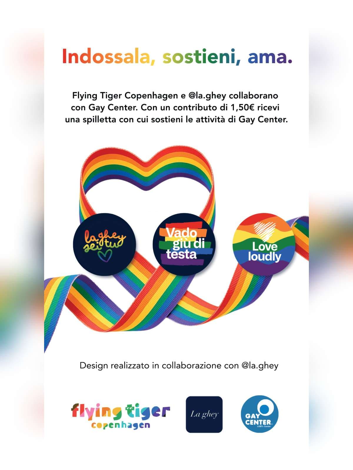 Gay Center collabora con @la.ghey e Flying Tiger Italia nella campagna “Indossala, sostieni, ama” per sostenere la Comunità LGBTQIA+. Passando in uno dei negozi Flying Tiger in Italia e con un contributo simbolico di 1,50€, puoi ricevere una spilletta esclusiva di Gay Center disegnata insieme a @la.ghey. Il ricavato andrà a supportare le attività di Gay Center, come: