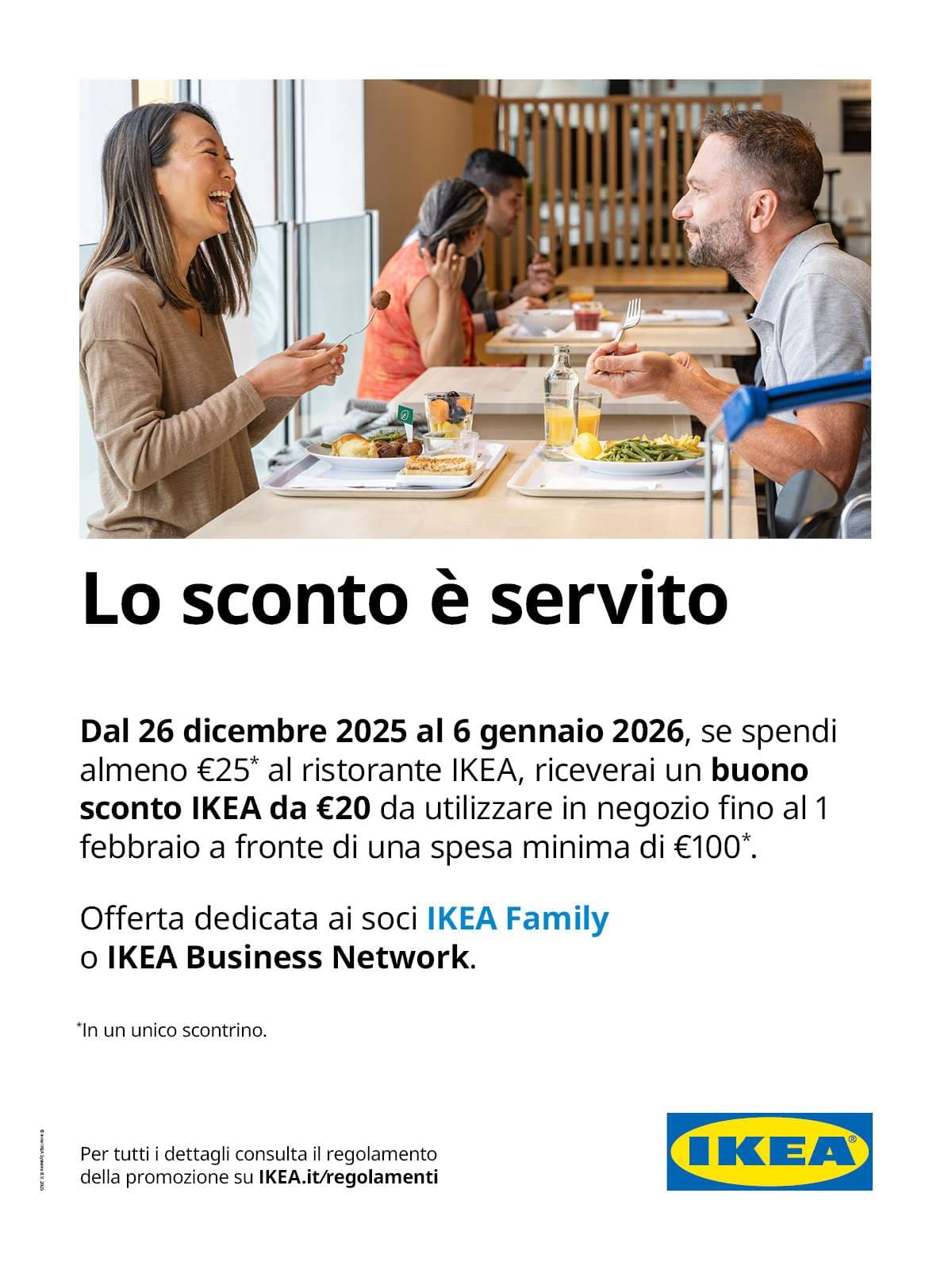Dal 26 dicembre 2025 al 6 gennaio 2026, se spendi almeno €25* al ristorante IKEA, riceverai un buono sconto IKEA da €20 da utilizzare in negozio fino al 1 febbraio a fronte di una spesa minima di €100*.