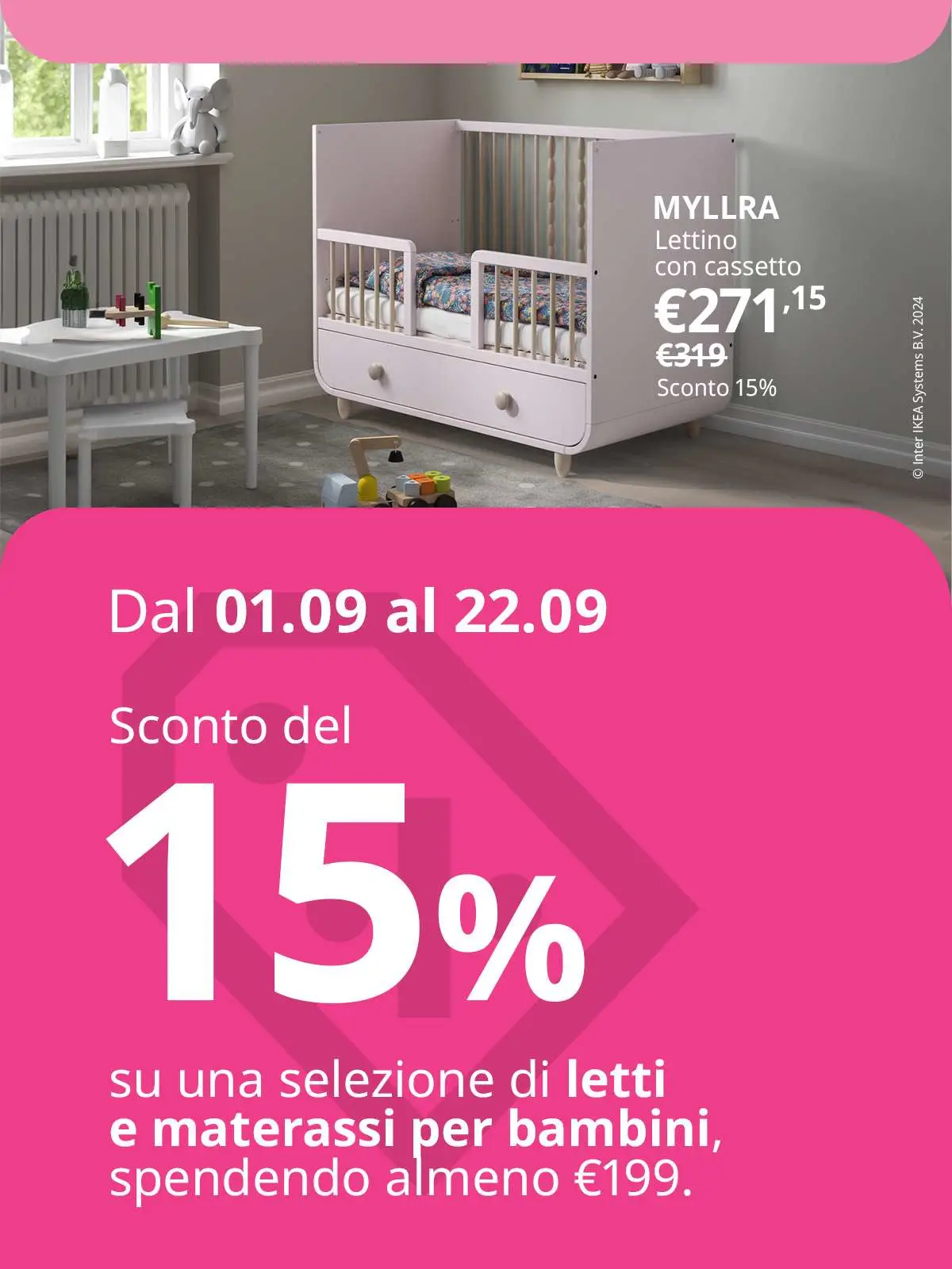 Dal 01.09 al 22.09 sconto del 15% su una selezione di letti e materassi per bambini, spendendo almeno €199.